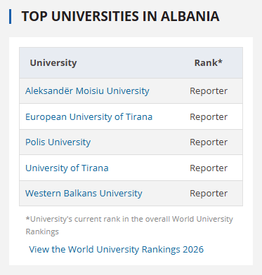 Në Shqipëri, të gjitha universitetet e listuara në WUR 2026 mbeten në statusin Reporter, pra pjesëmarrëse, por jo të klasifikuara me renditje numerike.