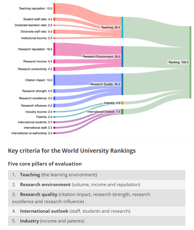 Renditja bazohet në 18 tregues të ndarë në pesë fusha: mësimdhënie, mjedis kërkimor, cilësi kërkimi, perspektivë ndërkombëtare dhe lidhje me industrinë.