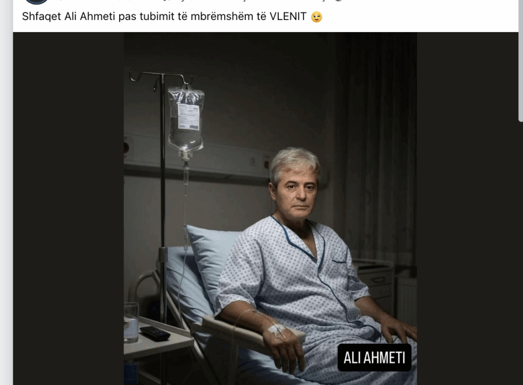 Një fotografi që ka qarkulluar në Facebook përgjatë fushatës elektorale të shtatorit pretendonte se Ali Ahmeti, udhëheqësi i Bashkimi Demokratik për Integrim (BDI) në Maqedoninë e Veriut, ndodhej i shtruar në spital. Postimi që shoqëron foton pretendon se kjo gjendje shëndetësore ishte pasojë e një tubimi të koalicionit të partive shqiptare VLEN, të cilët janë kundërshtarët e BDI. Megjithatë, nuk ka asnjë dëshmi të besueshme që një gjë e tillë ka ndodhur, ndërsa verifikimi i pamjes ngre dyshime për një imazh të krijuar përmes Inteligjencës Artificiale.
