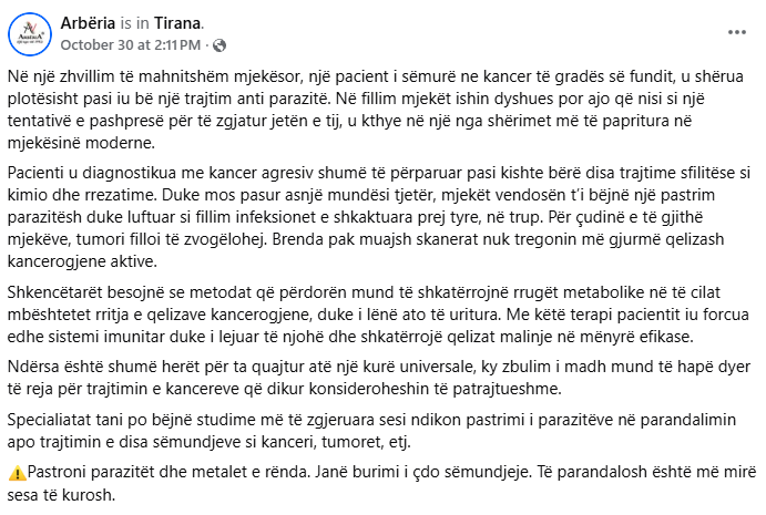 Në rrjete sociale, përfshi ato shqipfolëse, po qarkullon pretendimi se barnat antiparazitarë janë përdorur në një terapi eksperimentale që çoi në kurimin e plotë të një pacienti me kancer terminal.