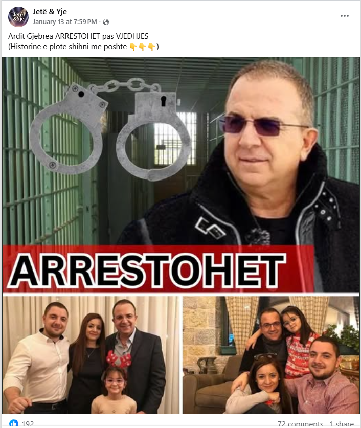 Një postim që ka marrë gati 200 pëlqime në Facebook njofton se prezantuesi shqiptar Ardit Gjebrea është arrestuar për vjedhje, ndërsa lexuesit ftohen të klikojnë një lidhje në komente për të mësuar më shumë.
