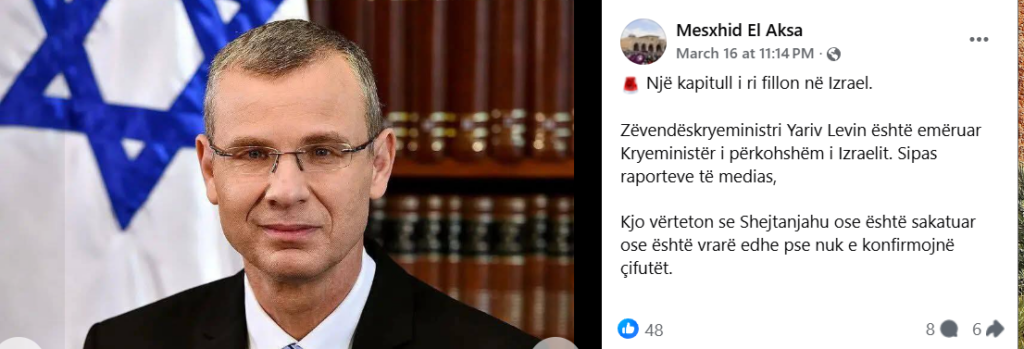 Në 16 mars 2026, në rrjete sociale, përfshi ato shqipfolëse, nisi të qarkullonte lajmi se zv. kryeministri izraelit Yariv Levin ishte emëruar kryeministër i përkohshëm i Izraelit duke zëvendësuar Benjamin Netanyahun. Postimet gjithashtu pretendojnë se kjo do të thotë se Netanyahu ka vdekur apo është plagosur sa është i paaftë të kryejë detyrat e tij si kryeministër.