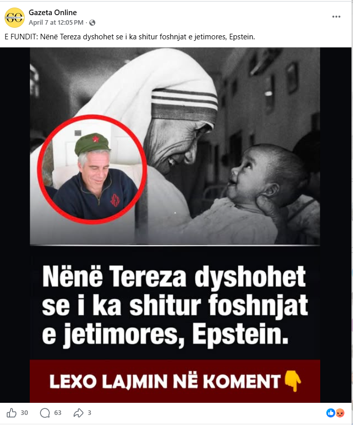 Në rrjete sociale, përfshi ato shqipfolëse, po qarkullon pretendimi i pazakontë se Nënë Tereza dyshohet se i ka shitur foshnjat e jetimores pedofilit dhe trafikantit famëkeq amerikan Jeffrey Epstein.
