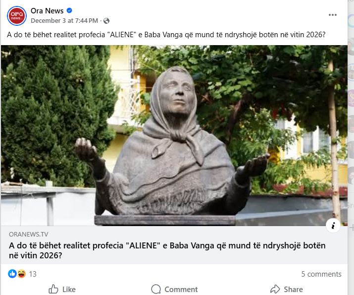 Teksa afrohet fundi i vitit dhe fillimi i një tjetri portalet shqiptare kanë nisur të riciklojnë titujt alarmantë për profecitë e ndryshme mbi vitin që na pret, përfshi ato që pretendohet se vijnë nga ‘parashikuesja’ bullgare Baba Vanga.