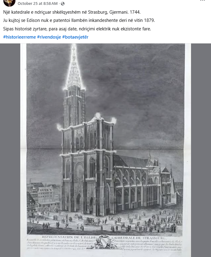 Pretendimi: Ky imazh tregon katedralen e Strasburgut më 1744 të ndriçuar me elektricitet mbi një shekull përpara shpikjes së llambës.