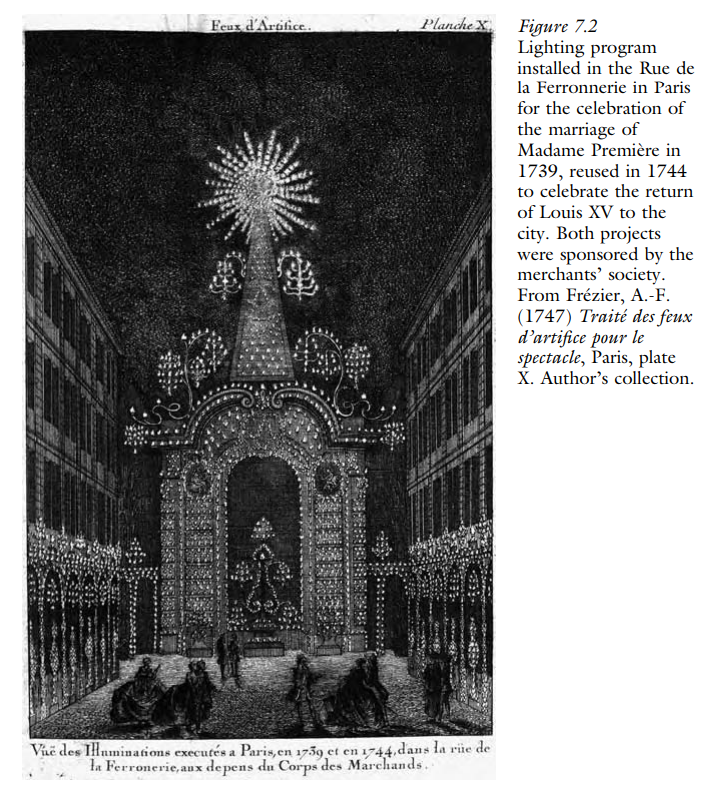 1751, me rastin e lindjes së pritur të Dukës së Burgundy, katër mbrëmje ndriçimi transformuan fasadat e Hôtel de Ville (bashkisë) në Paris dhe shtëpitë e përfaqësuesve të qytetit në një spektakël të pabesueshëm drite me mbi 92 mijë poçe zjarri dhe 35 mijë llamba me vajguri, për të mos përmendur mijëra fanarë kinezë dhe rrota Catherine, llamba Suresnes dhe fenerë të tjerë me kornizë teli të ngjitur në fasada.