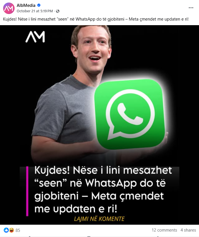 Pas përditësimit të fundit të aplikacionit të mesazheve WhatsApp, në rrjete sociale, përfshi ato shqipfolëse, qarkullon lajmi sensacionalist se “nëse i lini mesazhet “seen” në WhatsApp do të gjobiteni.”
