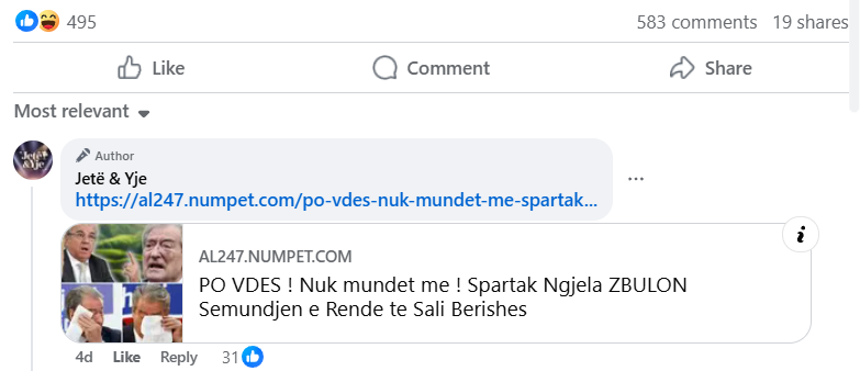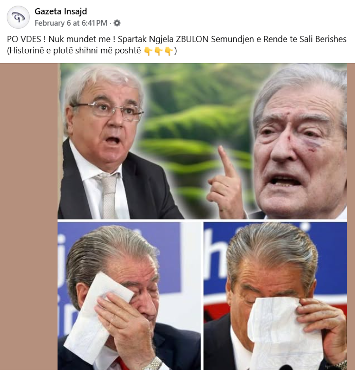 “PO VDES ! Nuk mundet me ! Spartak Ngjela ZBULON Semundjen e Rende te Sali Berishes” jep alarmin më 6 shkurt 2026 një artikull i portalit lifestories99.com, i cili ka marrë mbi 700 pëlqime të kombinuara në Facebook.