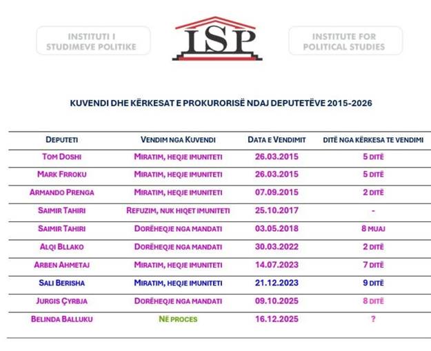 Të dhënat e Institutit të Studimeve Politike tregojnë se nga viti 2015 deri më 2025, Kuvendi ka marrë vendim për kërkesat e prokurorisë brenda pak ditësh, nga 2 deri në 9 ditë në shumicën e rasteve.