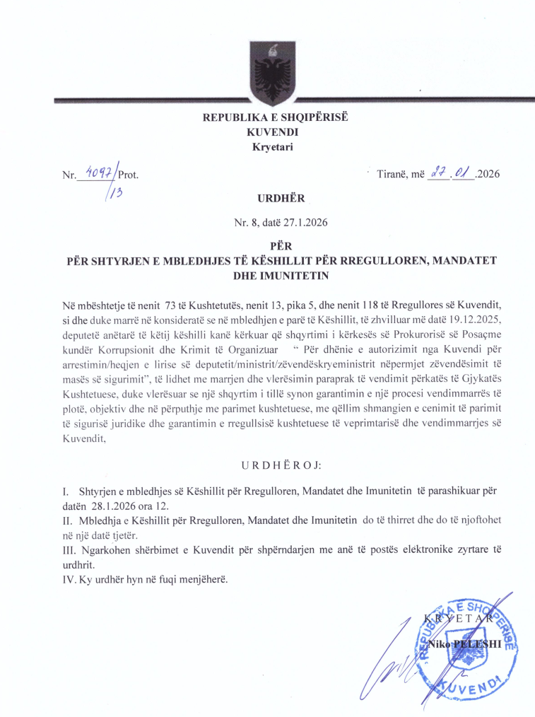 “…shqyrtimi i kërkesës së Prokurorisë së Posaçme kundër Korrupsionit dhe Krimit të Organizuar ‘për dhënie e autorizimit nga Kuvendi për arrestimin/heqjen e lirisë së deputetit/ministrit/zëvendëskryeministrit… të lidhet me marrjen dhe vlerësimin paraprak të vendimit përkatës të Gjykatës Kushtetuese, duke vlerësuar se një shqyrtim i tillë synon garantimin e një procesi vendimmarrjeje të plotë, objektiv dhe në përputhje me parimet kushtetuese…”– shkruhet në urdhërin e firmosur këtë të mërkurë nga kryetari i Kuvendit, Niko Peleshi.
