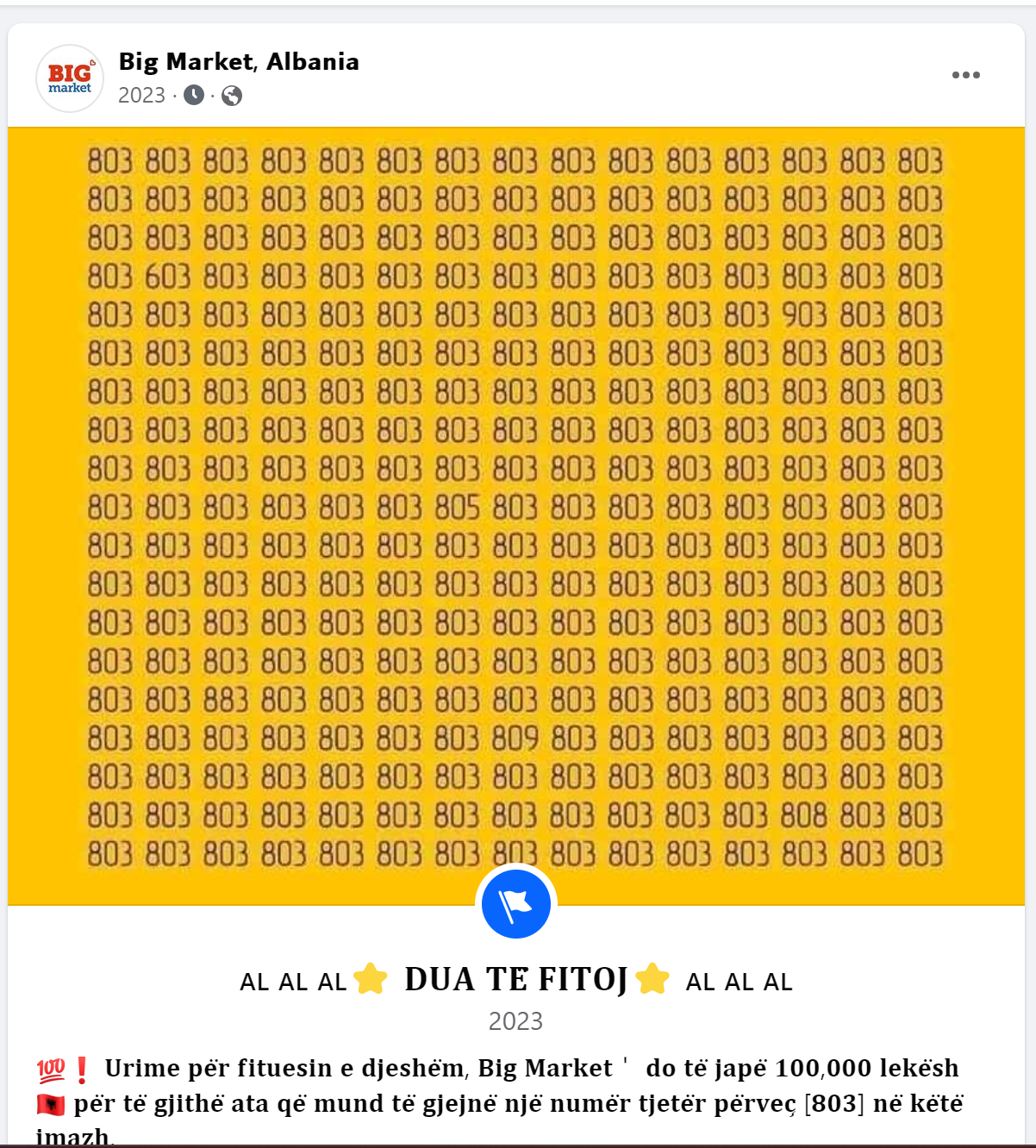 Postime të shpërndara në rrjetet sociale pretendojnë se një prej marketeve të njohur në Tiranë, Big Market, ofron një shpërblim prej 100 mijë lekësh për ata ndjekës që gjejnë një numër në një foto të publikuar krahas shkrimit.