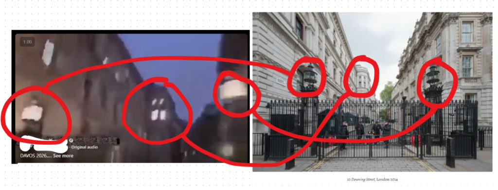 Video e mësipërme nuk është xhiruar në Davos, në Zvicër, por në Downing Street, Londër. Kjo dëshmohet nga një krahasim pamor i videos me pamje të rezidencës zyrtare të Kryeministrit britanik në Londër.