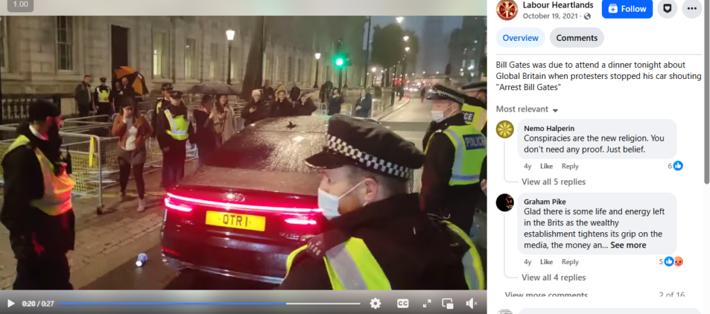 Sipas revistës Newsweek, më 18 tetor 2021, protestues në Londër u mblodhën rreth një makine dhe bllokuan rrugën që të çonte në Downing Street me disa që bërtisnin “arrestoni Bill Gates” dhe mbanin pankarta kundër vaksinimit. Policia përfundimisht e shoqëroi automjetin në një hyrje tjetër të Downing Street. Nuk dihet se kush ishte në makinë.
