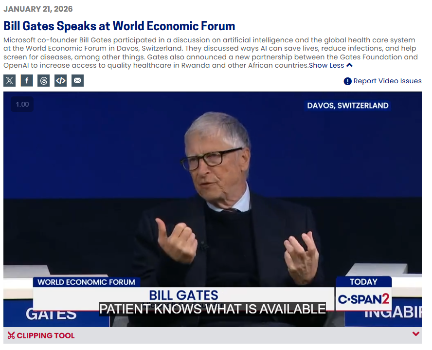 Takimi vjetor i Forumit Ekonomik Botëror 2026 u zhvillua në Davos të Zvicrës, midis 19 dhe 23 janarit. Pamje filmike tregojnë se Gates ishte i pranishëm.