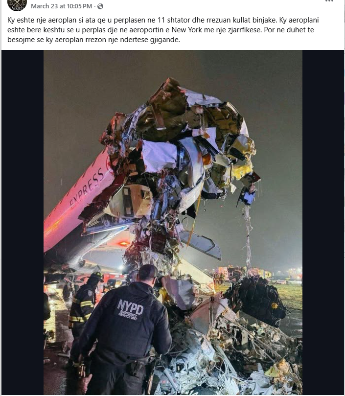 Përplasja vdekjeprurëse e një avioni me një makinë zjarrëfikëse në New York, më 22 mars 2026 po përdoret nga konspiracionistët për të ‘provuar’ se sulmet e 11 shtatorit 2001 që shkatërruan Kullat Binjake ishin të inskenuara.
