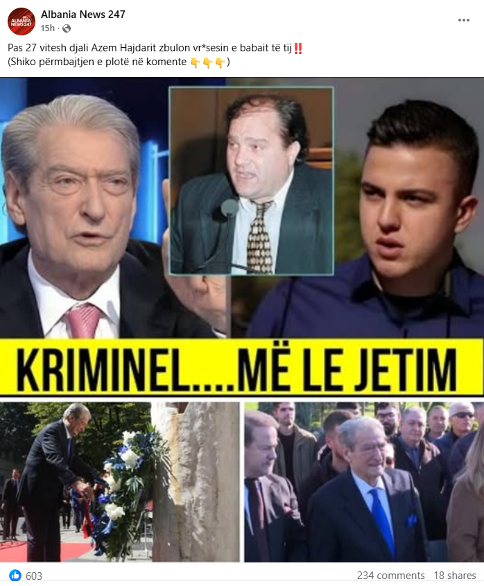 Një postim që ka marrë mbi 600 pëlqime në Facebook pretendon se djali i politikanit të ndjerë shqiptar Azem Hajdari ka zbuluar se kush e ka vrarë të atin, ndërsa i fton lexuesit të klikojnë një lidhje në komente për të mësuar më shumë. Kolazhi i fotos kryesore përfshin në mënyrë të dukshme portretin e kreut të Partisë Demokratike, Sali Berisha, duke nxitur dyshime se ish-kryeministri është që qendër të akuzës.