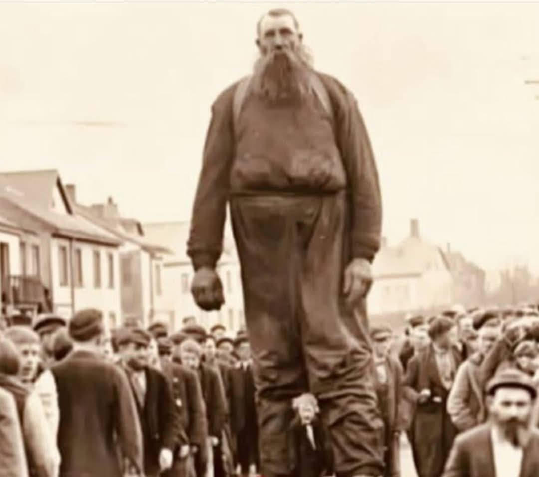 Një imazh që po qarkullon në rrjete sociale, përfshi ato shqipfolëse, i përngjason një fotografie të vjetër, dhe tregon një burrë shumë të madh në mes të një turme njerëzish me madhësi normale. Imazhi prezantohet si të ishte një foto e vërtetë.