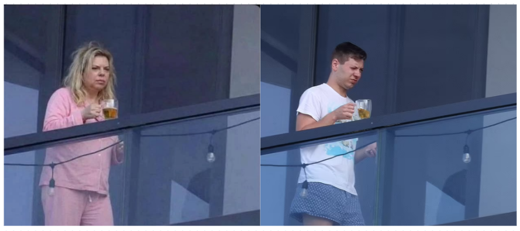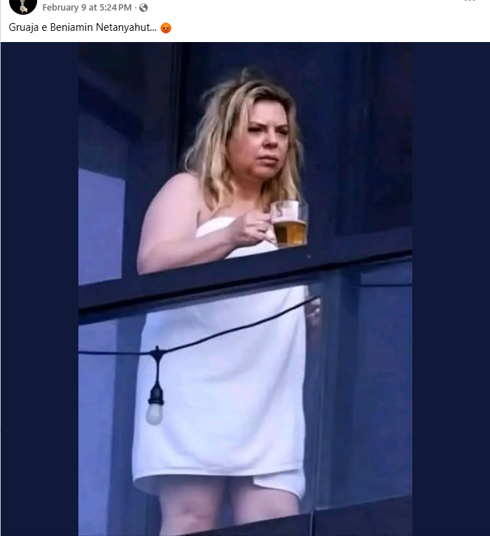 Një imazh që po qarkullon në rrjete sociale, përfshi ato shqipfolëse, pretendohet se tregon Sara Netanyahum, gruan e kryeministrit izraelit Benjamin Netanyahu, me peshqir në ballkon duke mbajtur një gotë me çfarë duket si birrë.