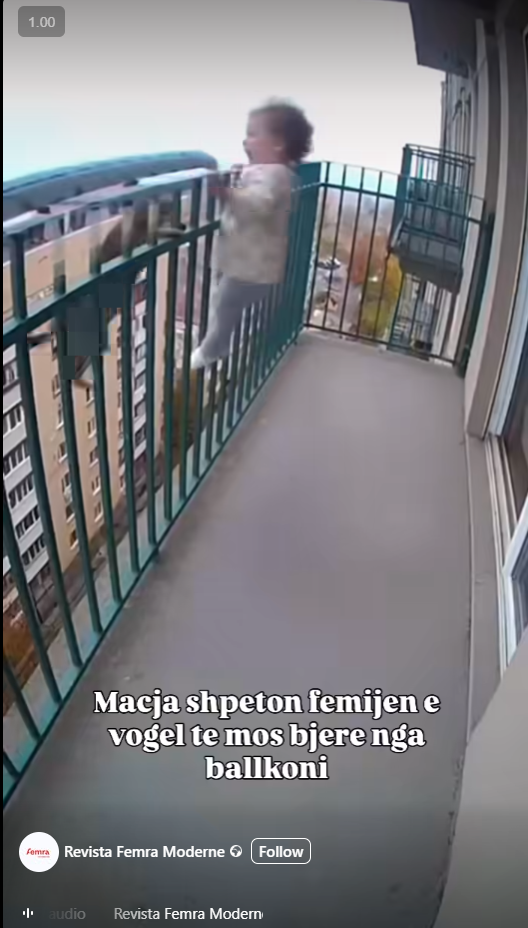 Një video që ka marrë gati 800 pëlqime në Facebook pretendohet se tregon një mace që shpëton një fëmijë të vogël nga rënia nga ballkoni.