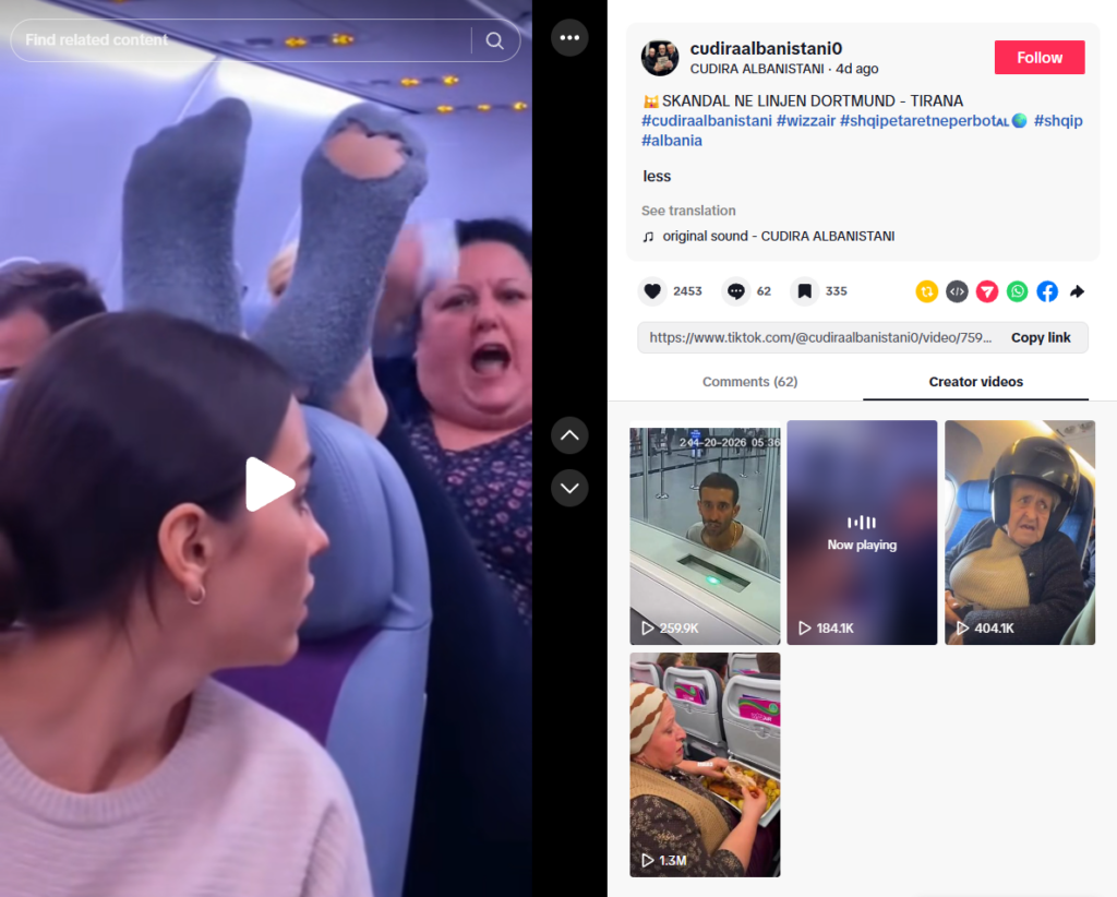 Origjina e gjeneruar e videos është veçanërisht e dukshme në mënyrën e panatyrshme dhe shqipen e çalë që flet pasagjerja e avionit.