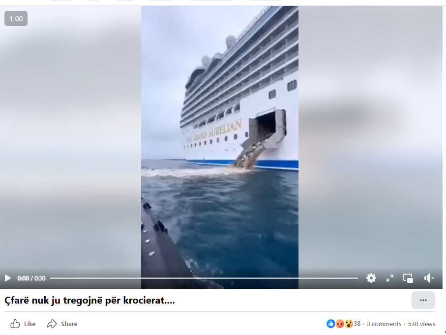 Një tjetër detaj që shquhet në video është emri i shkruar përgjatë trupit të kroçierës: “The Grand Aurelian.” Megjithatë, nga një kërkim në rrjet rezulton se nuk ekziston ndonjë anije kroçierë e quajtur “The Grand Aurelian.”