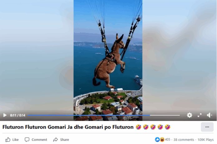 Një video që ka marrë qindra pëlqime në rrjetet sociale duket se tregon një gomar që është duke fluturuar në ajër me parashutë.