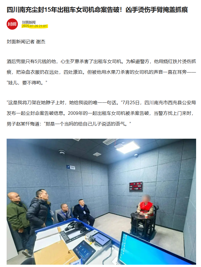 Ky imazh shfaqet në raportin e një hetimi të policisë së Xichong të publikuar në korrik 2025 në WeChat. “Pas 15 vitesh, një rast i pazbuluar më në fund është zgjidhur”, deklaronte policia. Ata shpjeguan se autoritetet më në fund kishin zgjidhur vrasjen e një “shoferi taksie në rrugën unazore të distriktit Xichong më 4 nëntor 2009”, “falë përpjekjeve të kombinuara të disa brezave të hetuesve”.