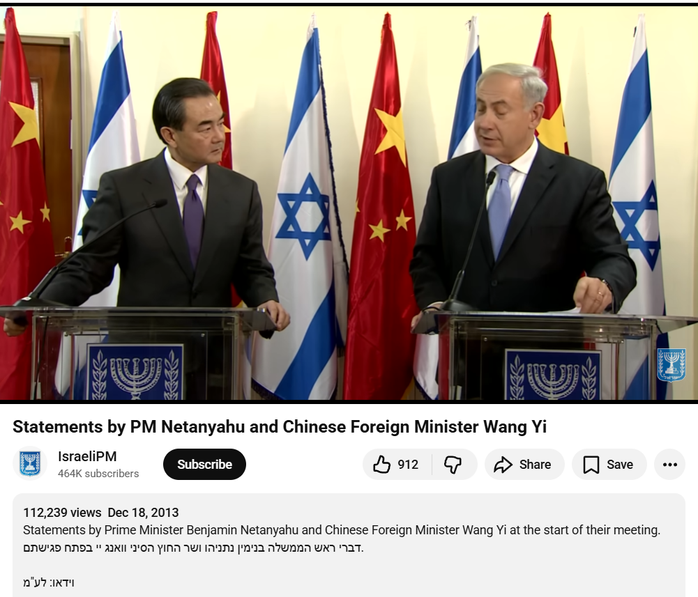 Sipas përshkrimit të videos, ajo tregon deklaratat e Netanyahu dhe Yi në fillim të takimit të tyre, i cili u raportua në atë kohë edhe nga Ministria e Jashtme e Kinës. Sipas medias vendase, Netanyahu bëri thirrje për lidhje më të mëdhaja tregtare, ndërsa Wang Yi theksoi rëndësinë e bisedimeve të paqes me Palestinën. Netanyahu përsëriti se Irani nuk duhet të kishte “aftësi” për të zhvilluar armë bërthamore.