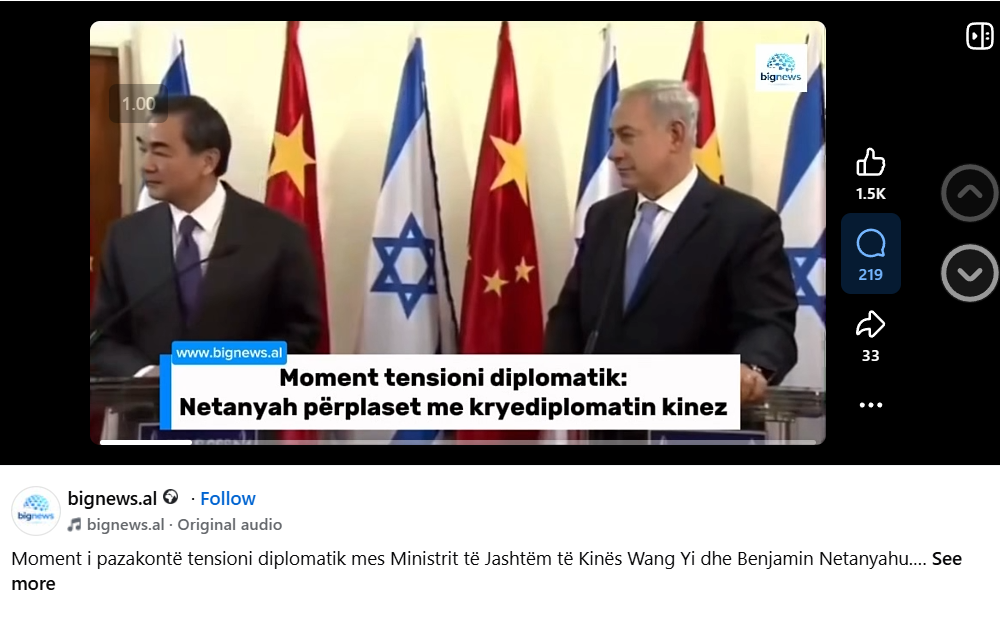 Pretendimi: Kjo video tregon një moment të tensionuar mes ministrit të Jashtëm kinez Wang Yi dhe kryeministrit izraelit Benjamin Netanyahu