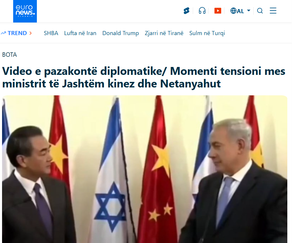 Në prill 2026, në rrjete sociale dhe mediat shqipfolëse qarkulloi një videopretendohet se tregon një “moment të tensionuar” mes Ministrit të Jashtëm kinez Wang Yi dhe kryeministrit izraelit Benjamin Netanyahu. Mediat pretendojnë se video “nxjerr në pah problemet në rritje mes dy vendeve.” Video po ndahet pikërisht në momentet që Kina u ofrua si një negociatore e re pas dështimit të bisedimeve të para të paqes mes ShBA dhe Iranit në Pakistan.