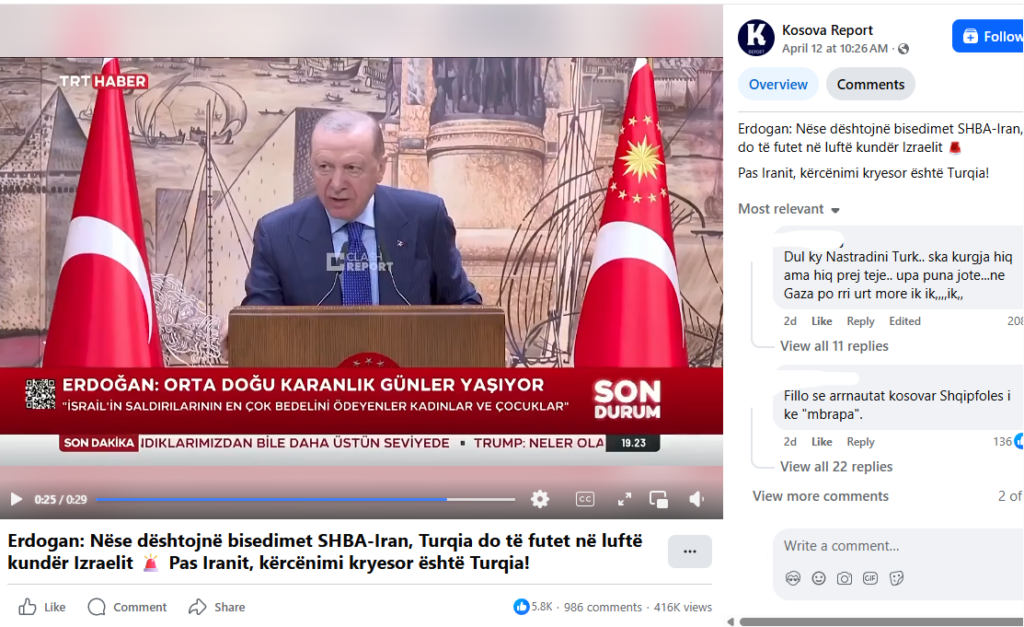 Një video e presidentit turk Erdogan po shpërndahet në rrjetet sociale dhe mediat shqipfolëse në prill 2026 me pretendimin se Erdogan ka kërcënuar se nëse dështojnë bisedimet mes ShBA dhe Iranit, Turqia do të futet në luftë kundër Izraelit. Një nga këto postime që shton më tepër situatën e ankthit është parë mbi 400 mijë herë nga përdoruesit.