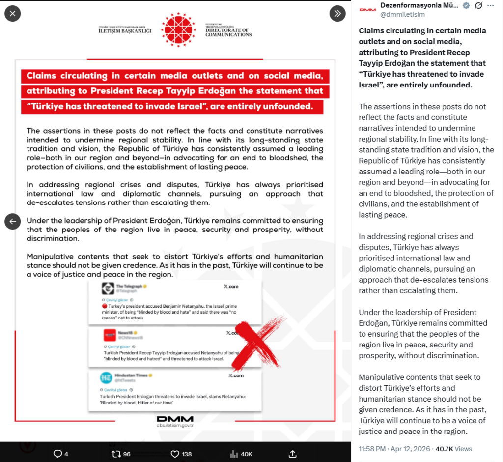 Pak ditë më parë, në 12 prill, gazeta britanike Daily Telegraph u detyrua të kërkojë falje dhe fshijë një tjetër artikull që i atribuonte në mënyrë të rreme deklarata nxitëse lufte me Izraelin Erdoganit. Raporti citonte presidentin turk të thoshte: “Ashtu siç hymë në Libi dhe Karabak, mund të hyjmë në Izrael”, deklarata që i përkisnin një fjalimi të vitit 2024. Kryeredaktori i gazetës pranoi se citimet ishin “të vjetra ose plotësisht të sajuara”.