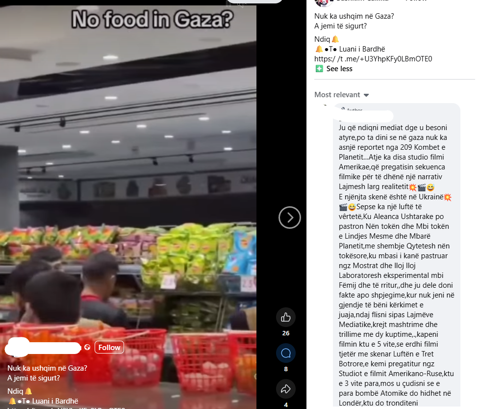 Pretendimi: Kjo video që tregon supermarketet plot në Gaza provon se nuk ka uri apo zi buke në Gaza