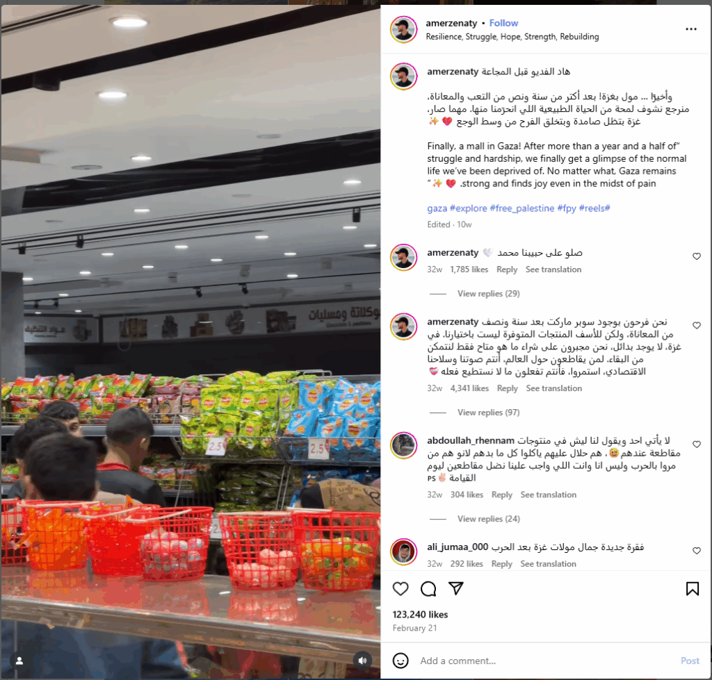 Ajo mban përshkrimin: “Më në fund, një qendër tregtare në Gaza! Pas më shumë se një viti e gjysmë përpjekjesh dhe vështirësish, më në fund ia dalim të shohim jetën normale që na është privuar. Pavarësisht gjithçkaje, Gaza mbetet e fortë dhe gjen gëzim edhe në mes të dhimbjes. ❤️✨”