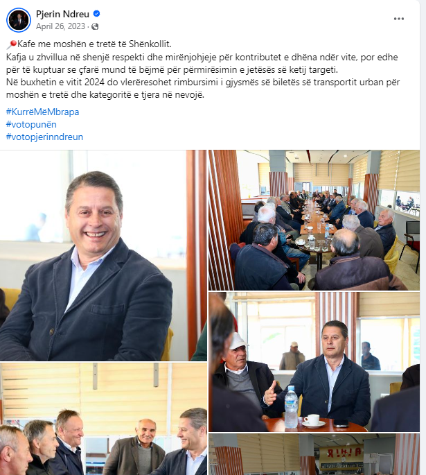 “Në buxhetin e vitit 2024 do vlerësohet rimbursimi i gjysmës së biletës së transportit urban për moshën e tretë dhe kategoritë e tjera në nevojë,” shprehej Ndreu gjatë një takimi me dhjetëra të moshuar në fshatin Shënkoll.