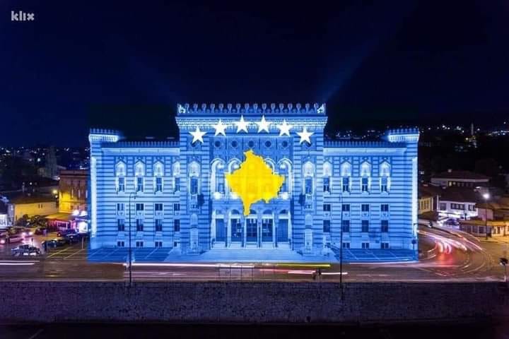 Foto e një godine të ndriçuar me ngjyrat e flamurit kosovar po shpërndahet në rrjete sociale si mbështetje e Bosnje-Hercegovinës ndaj Kosovës pas sulmit terrorist që la të vrarë një polic kosovar më 24 shtator 2023.