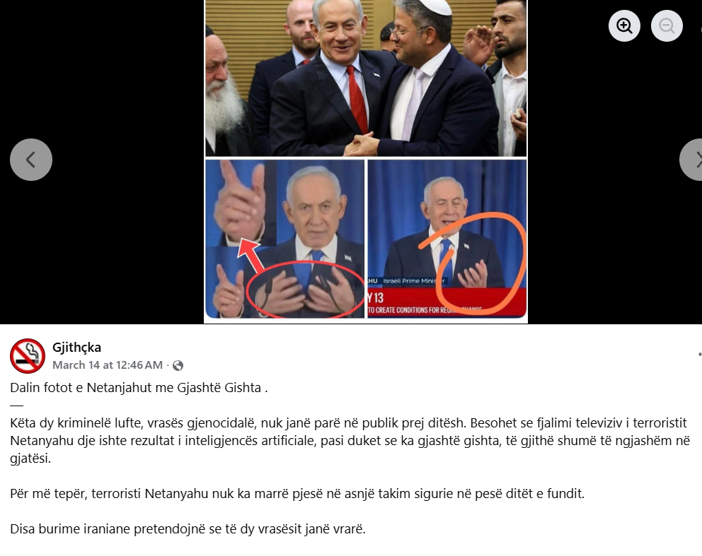 Pretendimi: Video e fjalimit të kryeministrit izraelit Benjamin Netanyahu është gjeneruar me programe të inteligjencës artificiale (AI) sepse Netanyahu shfaqet me gjashtë gishta. Kjo tregon se në të vërtetë ai ka vdekur.