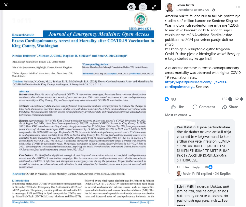 Në postimin e tij, Prifti i referohet një studimi të botuar në tetor 2024 në revistën Journal of Emergency Medicine me autorë Nicolas Hulscher, Michael Cook, Raphael Stricker, dhe Peter A. McCullough.