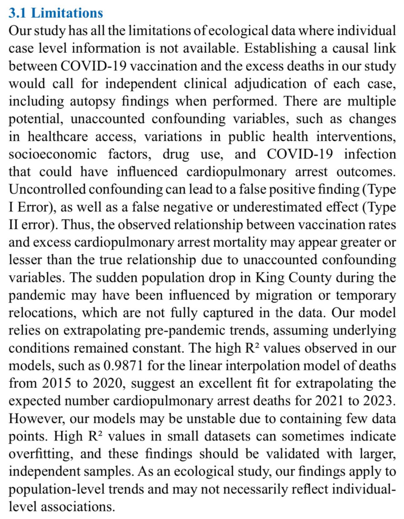 Më tej, kur shpjegojnë kufizimet e studimit, vetë autorët paralajmërojnë se ai nuk mund të përdoret për të provuar një lidhje shkak-pasojë mes vaksinimit dhe vdekjeve të tepërta. Provimi i një lidhjeje të tillë “do të kërkonte një gjykim të pavarur klinik të secilit rast, duke përfshirë gjetjet e autopsisë kur kryhet.”