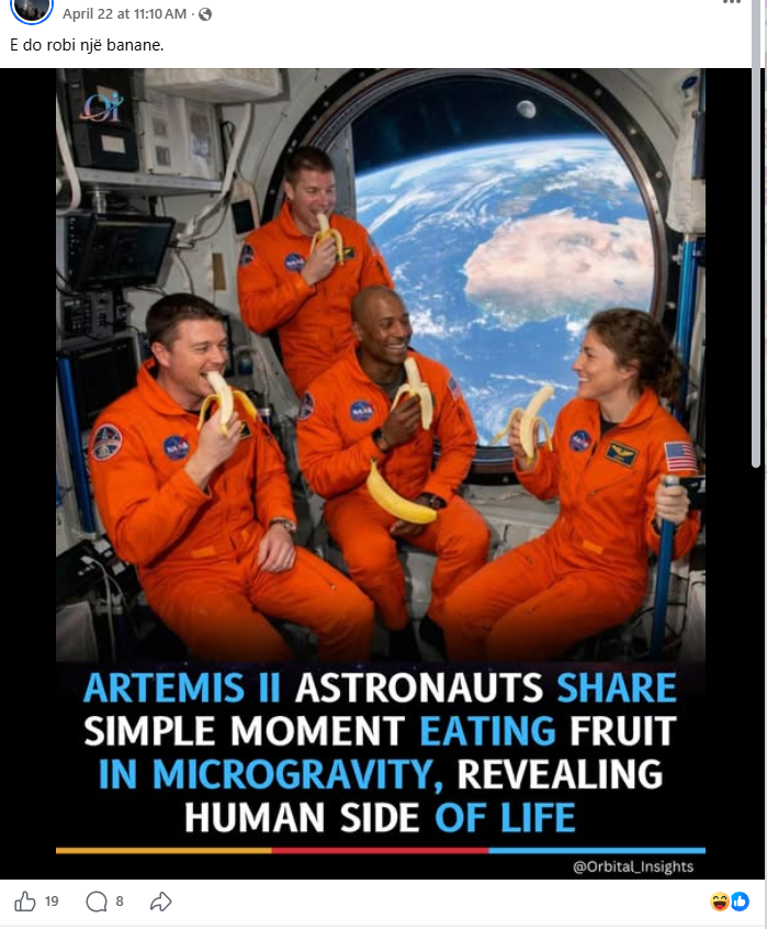 Një imazh që po qarkullon në rrjete sociale, përfshi ato shqipfolëse, pretendohet se tregon astronautët e misionit hapësinor Artemis II të NASA duke ngrënë banane në mungesë graviteti. Imazhi ndahet si një moment pushimi njerëzor edhe në këto kushte të pazakonta.