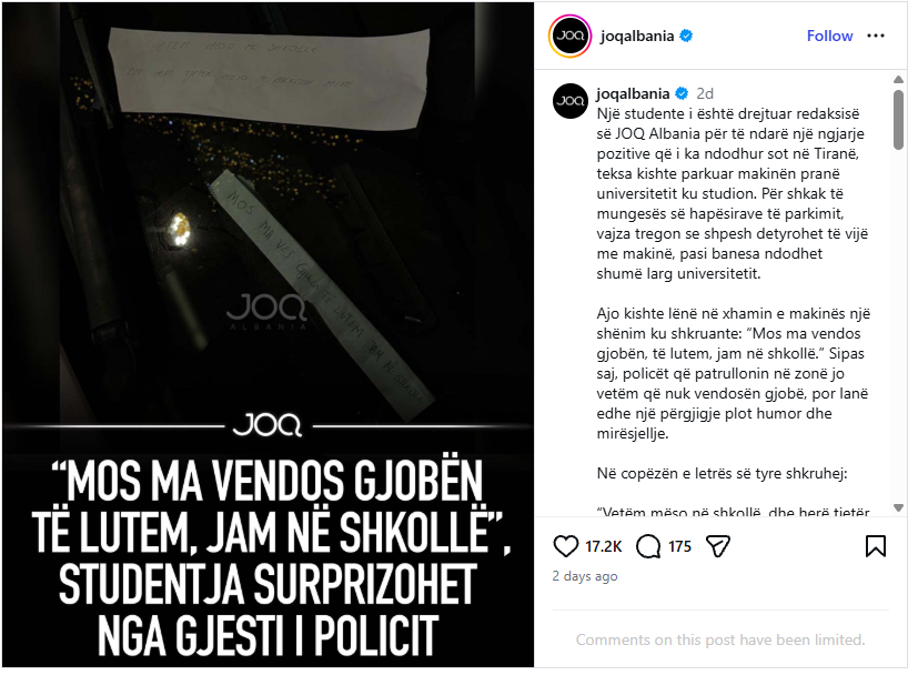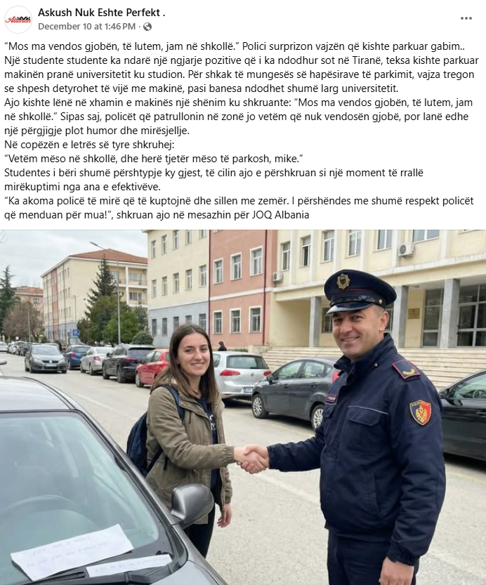 Në rrjetet sociale shqipfolëse po qarkullon një imazh që shoqërohet me një histori prekëse të një vajze, e cila kishte lënë një shënim në xhamin e makinës duke iu lutur policëve të mos i vendosnin gjobë sepse ishte në shkollë. Policët mirëkuptues nuk i kishin vënë gjobë, duke lënë një shënim të tyrin ku e nxisnin atë të mësonte në shkollë.