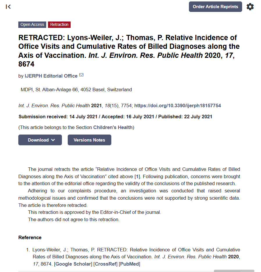 Studimi, i cili pretendonte se fëmijët me më pak vaksinime kishin më pak vizita në njërën prej praktikave private të autorëve, u tërhoq nga revista më 22 korrik 2021, pas shqetësimeve “lidhur me vlefshmërinë e përfundimeve”.