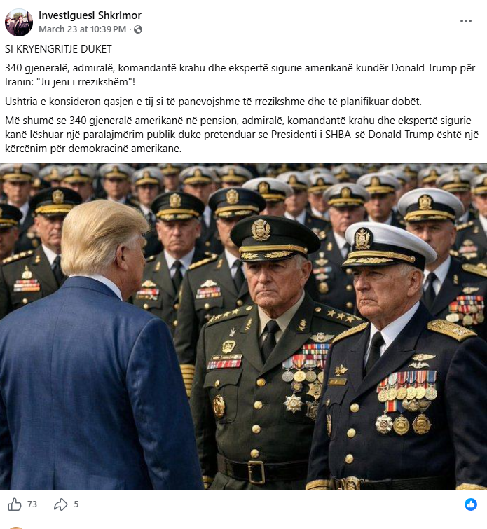 Si fillim duhet vërejtur që imazhi që shoqëron postimin nuk është real por me gjasa është gjeneruar me anë të programeve të inteligjencës artificiale (AI). Tregues i artificialitetit të imazhit janë turma e gjeneralëve që duken sikur janë klonuar, pasi janë kaq të ngjashëm. Më tej, një krahasim mes uniformave në imazh dhe uniformës së një gjenerali të vërtetë të ushtrisë amerikane, Mark A. Milley, tregon se ato përngjajnë vetëm përciptazi dhe nuk janë të njejta.