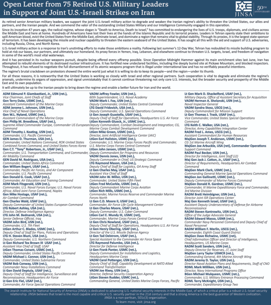 Për krahasim, Instituti Hebraik për Sigurinë Kombëtare të Amerikës (JINSA) botoi në fillim të marsit 2026 një letër të hapur në mbështetje të sulmeve të përbashkëta SHBA-Izrael ndaj Iranit nga 75 udhëheqës ushtarakë amerikanë në pension. Teksti i plotë i letrës u botua në faqen e JINSA dhe u raportua nga një numër mediash. Në përfundim të letrës, listohen dhe të gjithë emrat dhe gradat e nënshkruesve.