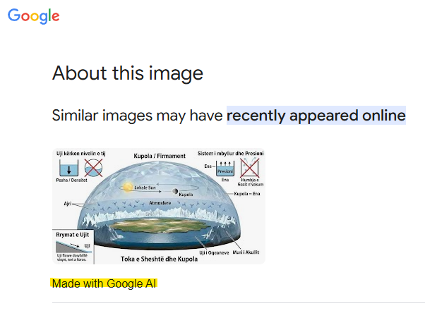 Një kërkim me motorrin e kërkimit pamor Google Lens konfirmon se imazhi i mësipërm është etiketuar si “I bërë me Google AI.” Një zëdhënës i Google ka thënë për AFP se kur zbulohet një gjurmë SynthID, kjo do të thotë që “imazhi është gjeneruar ose modifikuar me AI.” SynthID, i lançuar nga laboratori DeepMind AI i Google në 2023, identifikon imazhet e gjeneruara me Google AI.
