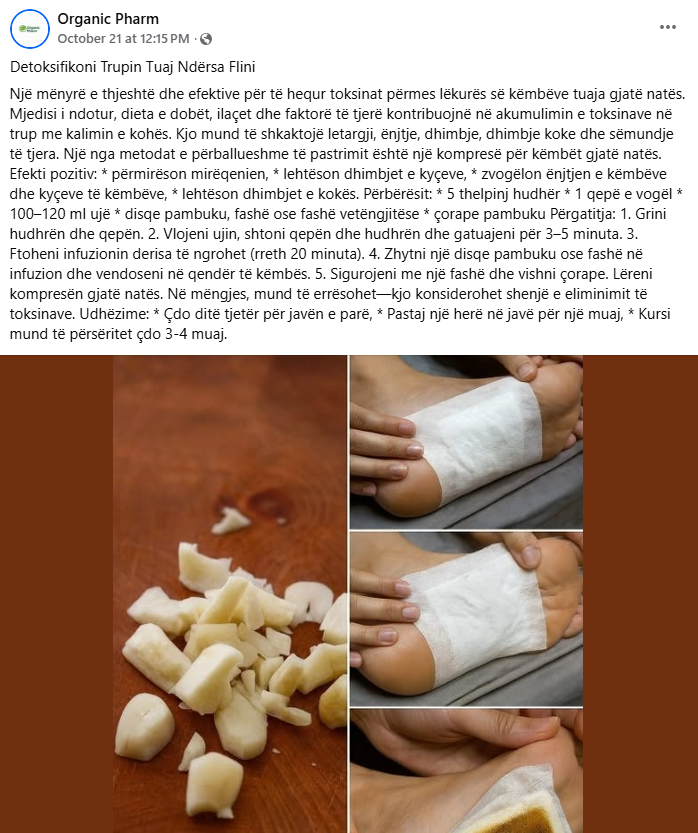 Një postim me mbi 300 pëlqime në Facebook udhëzon përdoruesit të përdorin një kompresë për këmbët me qepë dhe hudhra për të pastruar trupin nga toksinat.