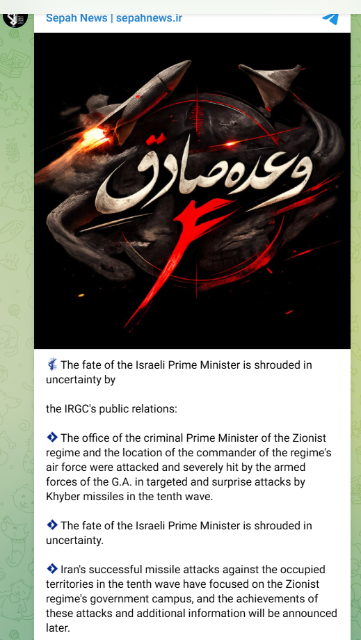 Ndërkaq, zyra e Netanyahu e ka hedhur poshtë këtë si “lajm të rremë” pretendimin iranian se fati i kryeministrit ishte i paqartë pas një sulmi me raketa që synonte Jerusalemin. Sipas mediave izraelite, nuk pati raportime për ndonjë goditje raketash në Jerusalem, pasi sirenat e sulmeve ajrore ranë në kryeqytet. Zyra e Netanyahut, sipas të gjitha të dhënave, ishte e paprekur.