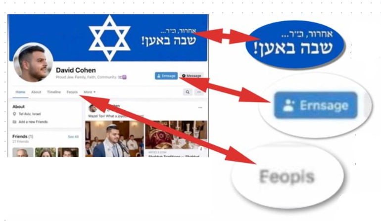 Ikona e mesazhit shkruan “Emsage” në vend të “Message.” Shkrimi hebraik në pjesën e sipërme djathtas nuk ka asnjë kuptim dhe nuk përkthehet në asgjë. Një nga seksionet e profilit shkruan “Eeopis” (ndoshta në vend të “Friends”), një fjalë pa kuptim që nuk përkthehet. Programet AI shpesh hasin vështirësi në gjenerimin e tekstit brenda imazheve.