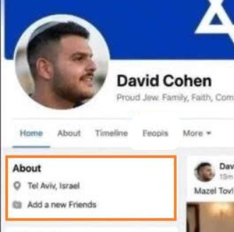 Profili “David Cohen” nuk përputhet me paraqitjen ose formatimin e llogarive të vërteta në Facebook. Nën seksionin “About”, shkruan “Shto një mik të ri”, një opsion që nuk gjendet në llogaritë e vërteta të Facebook.