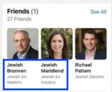 Më tej, disa nga miqtë e supozuar të listuar në profil kanë emra absurdë, të tillë si “Jewish (Hebre) Bronnen” dhe “Jewish (Hebre) Maridlend”.